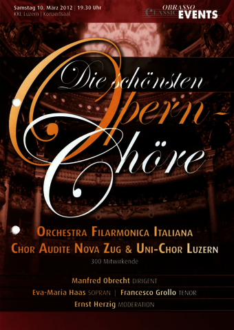 Zum ersten Mal durfte der Unichor Luzern im März 2012 im Konzertsaal des KKLs auftreten. Unter der musikalischen Leitung von Manfred Obrecht präsentierten das Orchestra Filarmonica Italiana, der Chor Audite Nova Zug und der Unichor Luzern dem Publikum "Die schönsten Opernchöre". Der Konzertabend im ausverkauften Saal stellte sowohl für die Sängerinnen und Sänger als auch für das Publikum ein eindrückliches Erlebnis dar.
